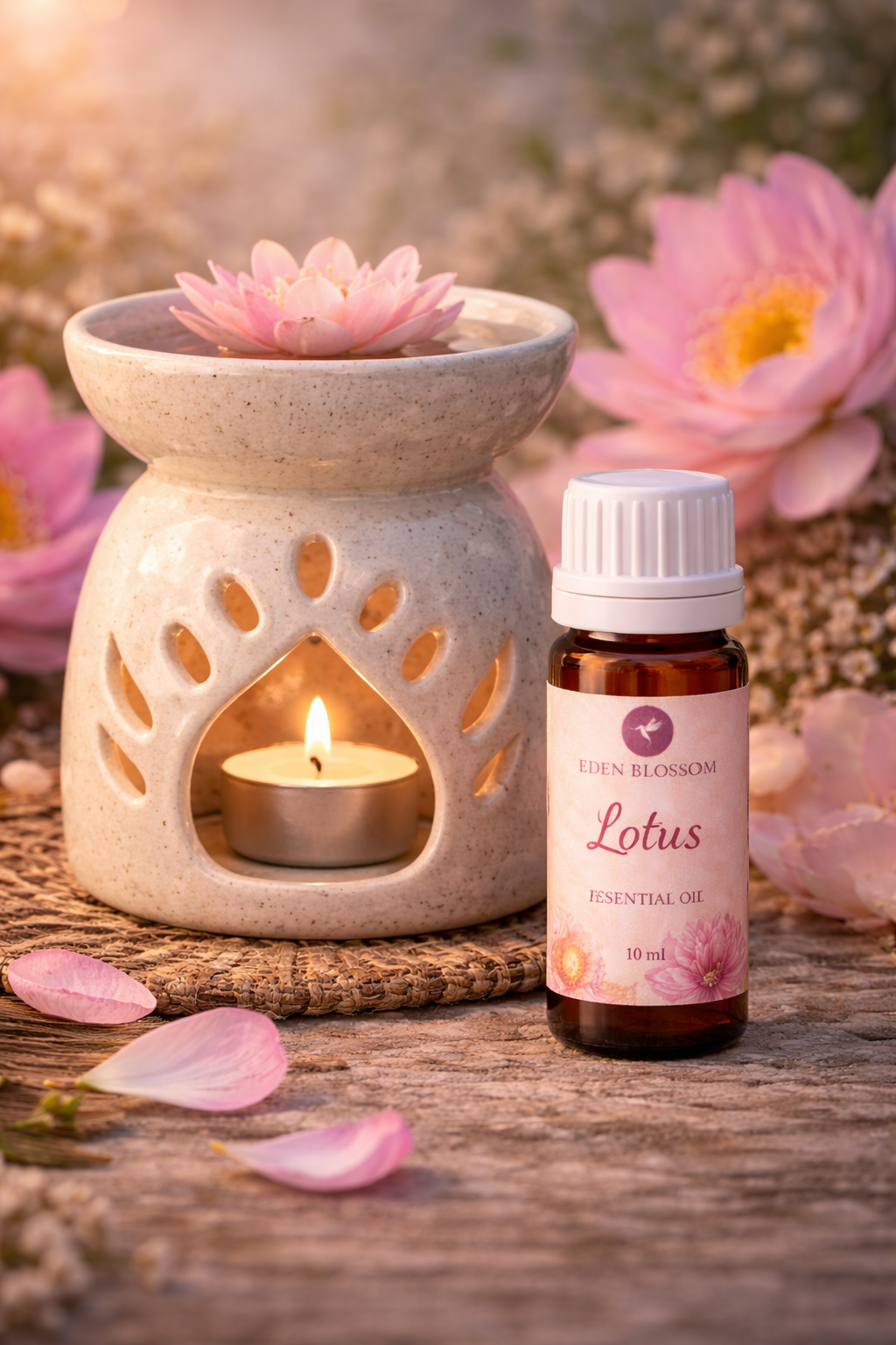 מבער לשמנים אתריים עבודת יד מקרמיקה איכותית וקסומה במודל לוטוס + שמן לוטוס כחול טהור.