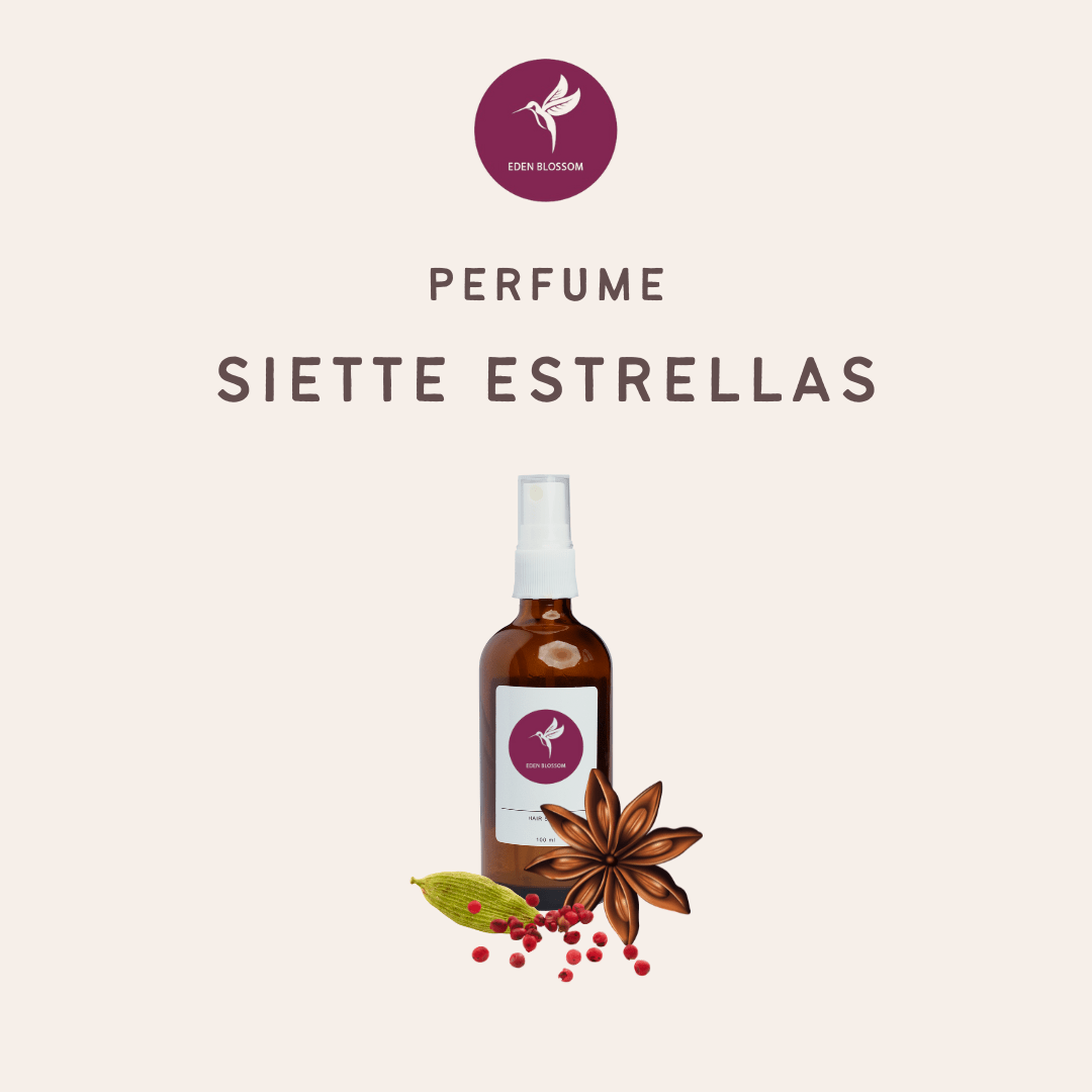 מי טיהור פרחוניים Siete Estrellas (שבעת הכוכבים) הם מי טיהור בעלי שבעה מרכיבים היוצרים מבנה אנרגטי עוצמתי. ניחוח התבלין המגבש והמהדק, שנותן פלפל (ורוד) לחיים. ההל צובע את החיים בשפע ומזרים שמחת חיים, כוכב האניס מדייק, והמוייה, הפלפל הורוד, העץ הקדוש של האינקה, מייצב ופותח לקבלה של האור, תוך כדי ייצוב וחוסן.